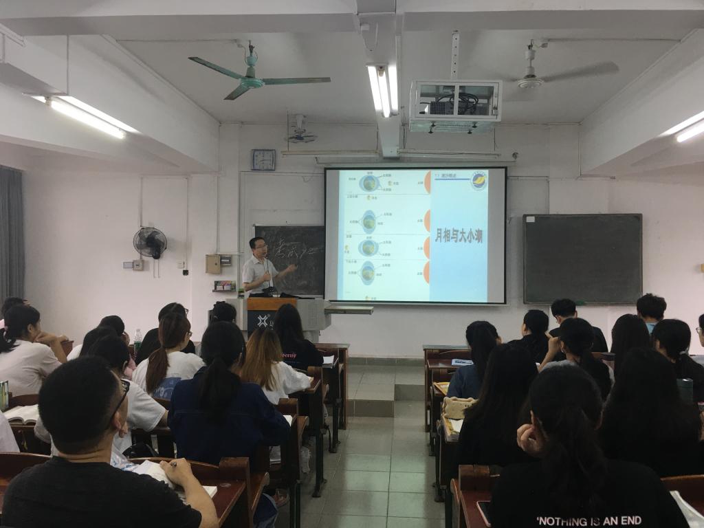 曹瑞雪老师以《海洋科学导论》中的“第七章 潮汐”展开授课,首先,对前次课的课后作业的易错点进行讲解,然后用多媒体与板书相结合的授课方式,从复习回顾前面章节知识点导入,讲授了潮汐的定义、研究意义和潮汐相关天文学知识。并联系实际,让员工在课堂演示天体运行规律,生动形象的演示了和潮汐相关的天文知识,并进行现场课程测试,让员工对潮汐相关的知识掌握的更加牢固。