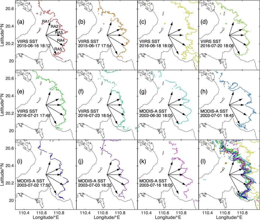 图1. 琼州海峡东口处上升流致冷水区西侧外缘线位置:(a)–(f)提取自VIIRS Level-2 SST数据;(g)–(k)基于MODIS Level-2 SST产品;(a)–(h)中冷水区外缘线的叠加展示于(l)。注:由于上升流在不同时间其强度动态变化,冷水区外缘线的提取基于不同温度值的等温线,(a)–(h)中所用等温线温度值依次为28.6, 28.5, 28.5, 28.5, 28.5, 28.3, 28.7, 27.5, 27.8, 27.2, 27.2 ℃。