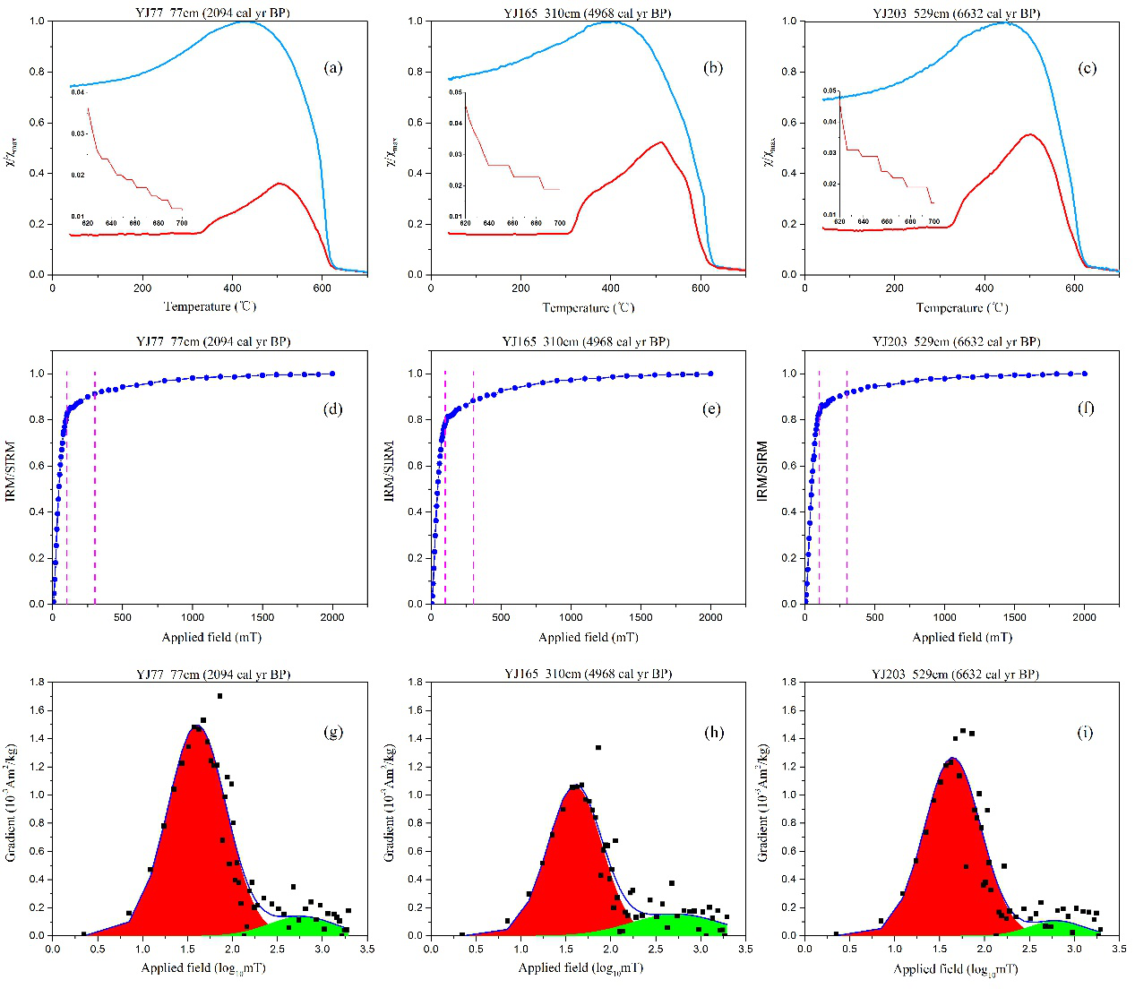 公司海洋地质团队成员黄超利用采自南海北部大陆架粤西泥质区的YJ Core岩芯做为研究对象(图1),通过210Pb和AMS 14C两种测年方法建立YJ Core岩芯的年龄–深度模式,开展系统的环境磁学研究工作,分析研究区沉积物的磁性参数的变化特征,并探讨研究区沉积物磁性特征的环境意义。该研究获取了研究区域过去7500年以来的高分辨环境磁学记录。研究表明YJ Core岩芯沉积物中的磁性矿物为碎屑成因,磁性矿物主要是磁铁矿,同时也含有少量的赤铁矿(图2)。YJ Core岩芯沉积物中磁性特征对气候变化响应灵敏,记录了过去7500年以来东亚夏季风的演变历史(图3)。7500–6800 cal yr BP期间,成壤作用的环境磁学χARM/χ和χARM/SIRM比值都依然保持相对较高的值,反映强盛的东亚夏季风;6800–3500 cal yr BP期间,磁性矿物含量指标ARM和磁性矿物粒度指标χARM/χ和χARM/SIRM的含量相对较高,可能反映相对湿润的气候,进而可能指示该时期相对强盛的东亚夏季风;3500–2000 cal yr BP期间,ARM和χARM/χ和χARM/SIRM相对较低,表明东亚夏季风相对较弱;近2000年以来,由于人类活动逐渐增强,YJ Core岩芯沉积物环境磁学指标可能不仅仅受气候变化的控制,而且可能主要受到日益增强的人类活动的影响。