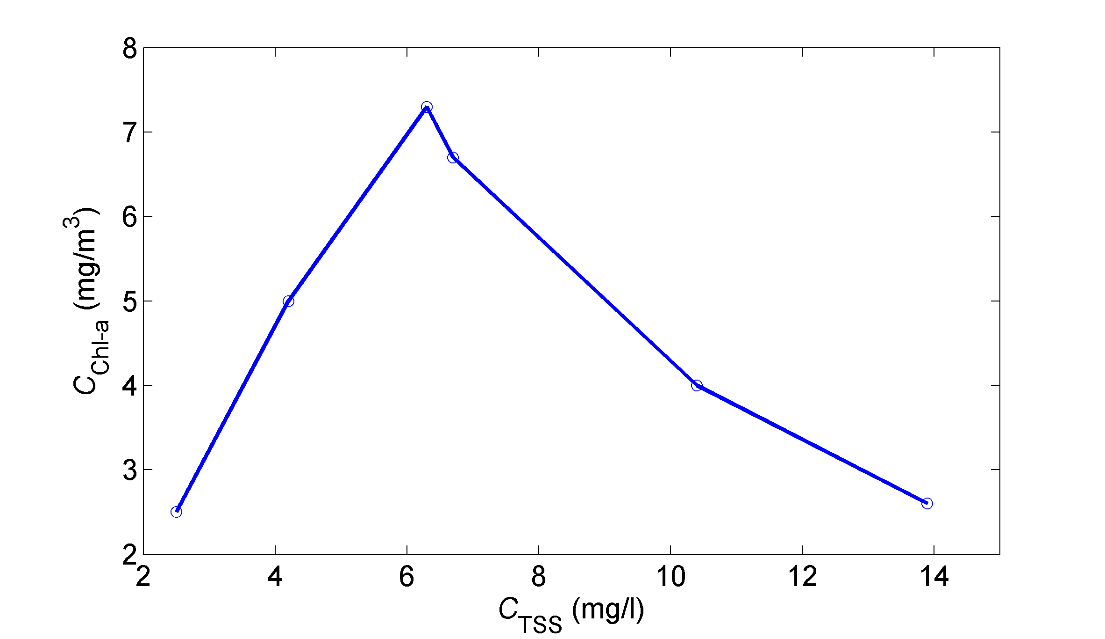 近岸、陆架及外海三个研究区域叶绿素a与悬浮物浓度的时间过程曲线(图2)显示出三个区域叶绿素a与悬浮物浓度增加特征并不相同。近岸区域受径流影响悬浮物浓度增加明显,但是叶绿素a浓度的峰值较悬浮物浓度延迟了5天。陆架区叶绿素a浓度与悬浮物浓度近似同步增加,并且发现该区域叶绿素a浓度在悬浮物浓度为6 mg/l时达到最大(图3)。外海区悬浮物浓度基本没有变化,而叶绿素a浓度增加了一倍。