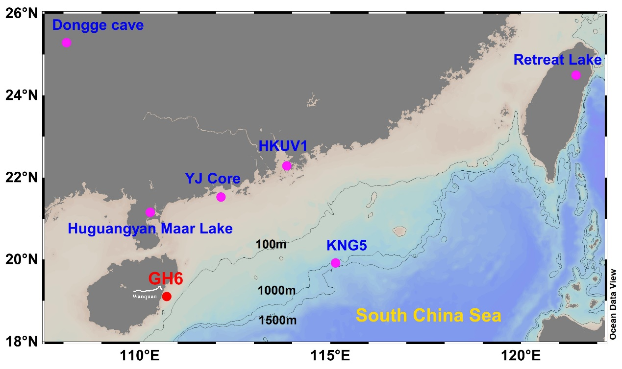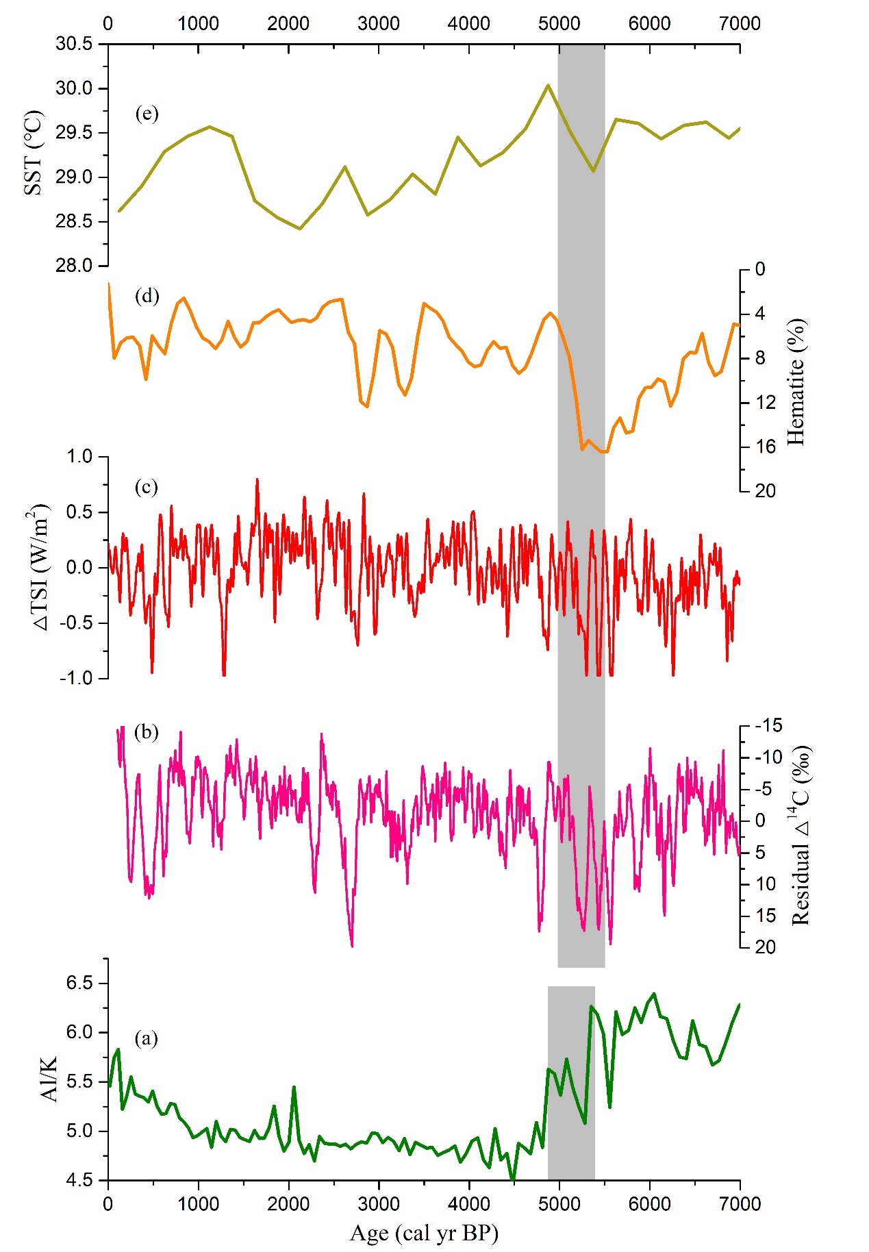 公司海洋地质团队成员黄超博士利用采自琼东海域大陆架GH6岩芯 (图1),通过AMS 14C测年建立岩芯的年龄–深度模式,进而开展高分辨的过去7000年气候演化与人类活动影响的重建工作。结果发现,在5400-4900 cal yr BP期间琼东地区发生了一次显著地气候突变事件,这与季风区其他研究发现的弱季风事件一致。该弱季风事件刚好与减弱的太阳活动、较强的ENSO活动以及北大西洋冰伐事件发生的时间吻合(图2),表明太阳活动可以通过影响ENSO系统和北大西洋对亚洲夏季风产生重要影响。近1500年以来,GH6岩芯记录的化学风化和陆源输入逐渐增强,且岩芯沉积物中的低频和频率磁化率大幅度增加,金属元素Cu和Pb的含量也迅速增加(图3)。这些岩芯沉积记录的增加趋势与海南岛的开发历史基本一致。然而,亚洲季风区多种地质载体的研究结果发现,夏季风在近1500年呈现整体减弱的变化(图3)。我们推测,由于人口的增加、农业生产的发展以及采矿冶炼活动的扩张,引起土壤侵蚀的增强和金属元素含量(Cu和Pb)的增加,进而导致陆源输入到近海陆架上沉积物的增加。因此,近1500年以来,琼东地区逐渐增强的人类活动取代了自然气候条件成为地表环境改造的主要控制力量。