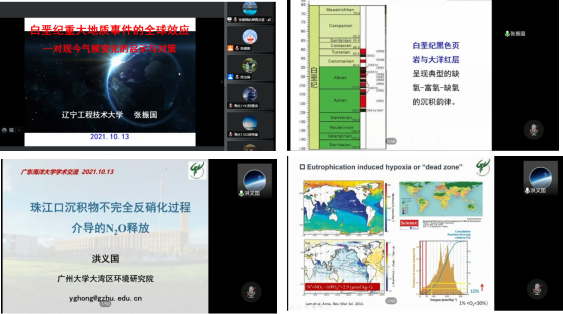辽宁工程技术大学的张振国教授首先为我们作了题为“白垩纪重大地质事件的全球效应----对现今气候变化的启示与对策”的学术报告。报告以介绍今年的诺内尔物理学奖为切入口,生动的解释了白垩纪时期发生了众多重大地质事件的重要意义,解释了这一时期是地球系统科学的关键与重要时期的实际意义。随后张教授介绍了白垩纪时期的大规模海底火山事件,对目前海洋科学海洋地质的参照意义,介绍了超级静磁带事件的研究成果和发展过程,最后介绍了大洋缺氧和富氧事件背景下白垩纪时期发生的重大地质事件的参考意义。并通过海洋碳收支、铁施肥试验和缺氧富氧事件的关系,讲述了在古地质层面上未来对全球气候变化的研究领域的几个热点问题和关键问题。