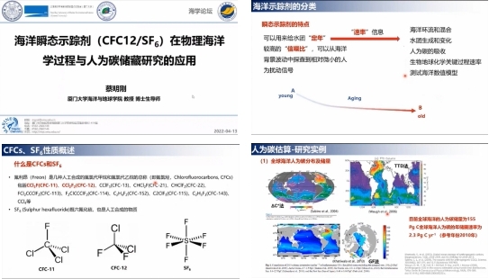 蔡明刚教授作了题为“海洋瞬态示踪剂(CFC-12/SF6)在物理海洋学过程与人为碳储藏研究的应用”的学术报告。蔡教授的报告主要围绕海洋瞬态示踪剂(CFC-12/SF6)在物理海洋学过程及人为碳储藏研究方面的应用展开,旨在阐明当前海洋化学与物理海洋学领域交叉研究现状与应用前景。蔡教授先是为我们简单介绍了海洋瞬态示踪剂及其分类,指出示踪剂在水体定年的重要意义,说明了利用化学手段研究海洋学过程的基本原理。紧接着,蔡教授阐述了不同瞬态示踪剂在定年时间尺度上的差别,进一步指出CFC-12与SF6作为常用瞬态示踪剂的优点并介绍了其性质、采样与测定原理。最后,蔡教授为我们介绍了目前国内外海洋瞬态示踪剂研究的概况,并列举了目前海洋瞬态示踪剂在海洋通风、人为碳估算与耗氧估算等方面的应用研究成果。