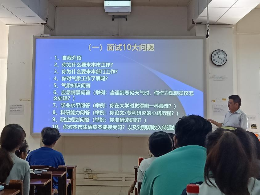 张夏琨老师指出本次报告将从三个方面来介绍,分别是大气科学类的主要就业方向,怎样制作一份用人单位认可的简历以及如何应对各种面试。