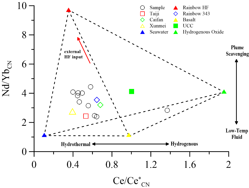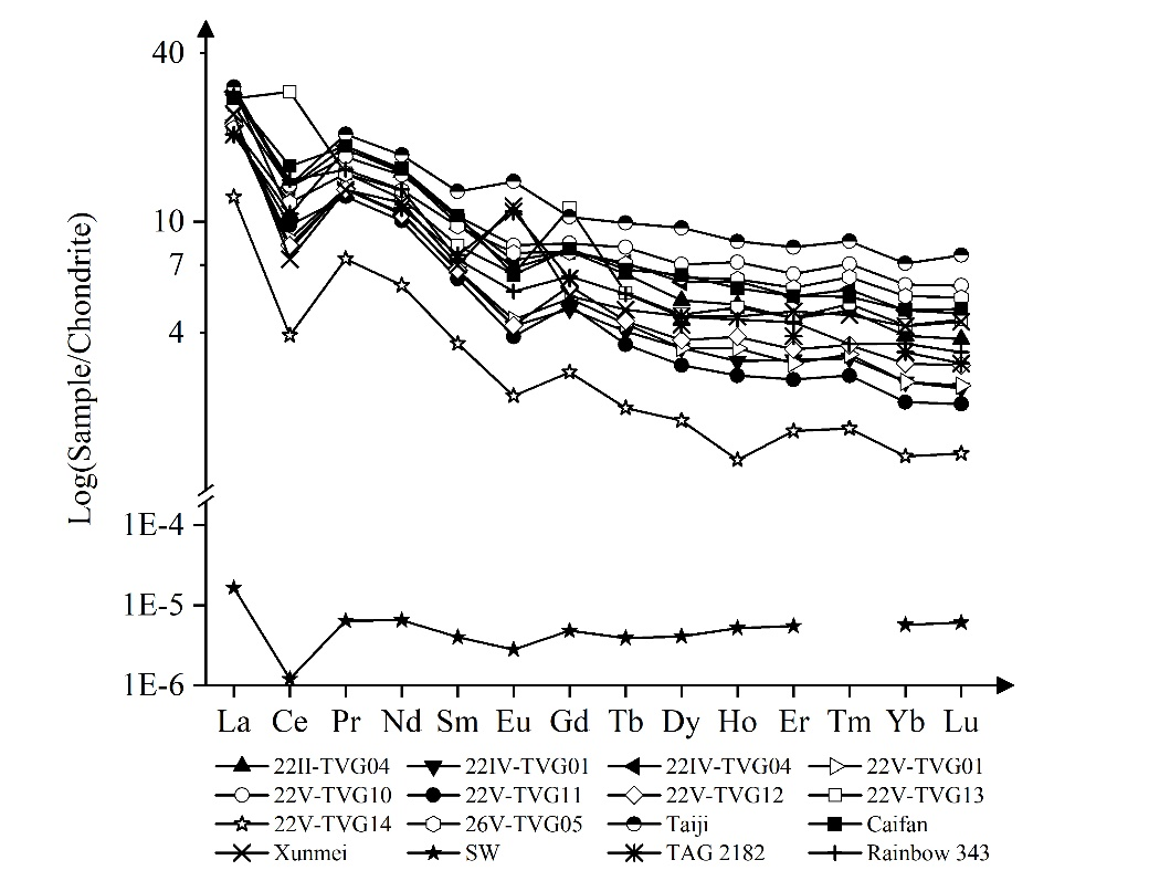 研究结果表明,靠近热液区的沉积物地球化学特征与远离热液区的沉积物相比,其代表性金属(如Fe、Mn、Mg、Cu、Zn、Co等)和REE明显富集,这些元素主要来源于热液活动。图2为样品的REE球粒陨石标准化配分模式图,样品具有LREE富集,Eu负异常的特征,证实了海水的混合作用。然而,样品REE分布模式与普遍热液流体的分布模式存在差异,主要归因于低温流体的扩散。其中,样品22Ⅴ-TVG13的Ce正异常可能归因于该样品中的Mn含量较高,Ce4+与Mn4+类质同象,从而取代了Mn结核晶格中的Mn4+。使用较少的(Nd/Yb)CN指标在本研究中被用来区分低温热液输入或羽状流的清除(图3),与“低温流体扩散”的结论相一致。同时,样品22V-TVG13的地球化学特征与热液区附近的样品相似,在该站位附近可能存在未被发现的热液区,这对我国未来对海底的矿产资源勘探具有重要的指示意义。
