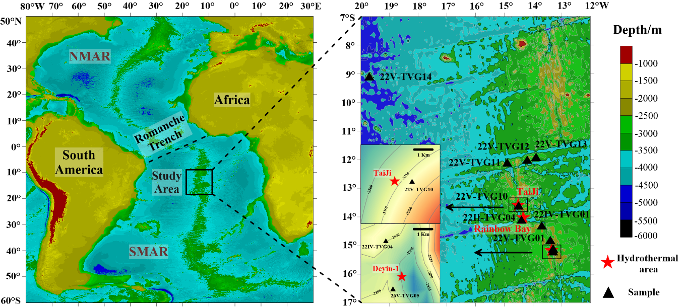 海底热液活动的发现是20世纪海洋科学研究中的重大事件之一,其与生命活动的调查研究已成为当代海洋科学、地质学、地球化学、矿床学及海洋生物学等多学科的重大前沿热液研究领域,同时也是国际海洋资源竞争的一个重要部分。本研究通过对比南大西洋洋中脊(SMAR)中位于12°S ~ 15°S之间的热液影响区和正常远洋沉积物的地球化学特征,揭示了热液活动对热液区周边沉积物的影响及稀土元素的来源。图1展示了研究样品的采集位置,其中22Ⅱ-TVG04、22Ⅳ-TVG04、22Ⅴ-TVG10和26Ⅴ-TVG05站位分别位于南大西洋的Rainbow Bay(Caifan)、TaiJi和Deyin热液区附近;并在本文中将样品22Ⅴ-TVG14作为正常远洋沉积物进行对比。