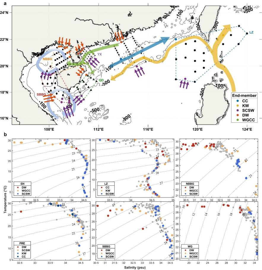 该研究团队提供了一个覆盖南海北部的海水的氢氧同位素(δ18O和δD)数据集,数据集包含夏季期间在169个站点采集的873对氢氧同位素样品,覆盖深度为0至3700米,核心参数包括δ18O、δD、温度和盐度。该研究基于统一的端元选择标准和同位素校正方法,应用SIAR同位素混合模型量化了各区域不同水团的贡献比例,从化学的角度刻画了南海北部的水团输运和环流特征。该研究填补了南海氢氧同位素数据的关键空白,建立了一套利用海水氢氧同位素定量解析水团输送的标准化方法,提出利用化学参数解析水团输运的技术体系,为海流和环流动力过程的研究提供了新思路。