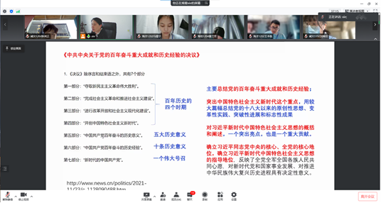 谢玲玲经理首先向我们介绍了我们党的历届中央全会和第十九届六届中央全会的讨论内容。2021年11月8日上午,中国共产党第十九届六中委员会第六次全体会议在北京召开,会议指出总结运用党的百年奋斗重大成就和历史经验,以史为鉴,开创未来。谢玲玲经理引导同学们学习党的百年奋斗历程,不忘百年奋斗路,砥砺奋进新征程。