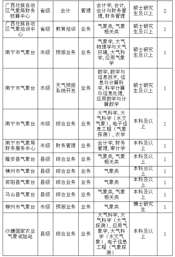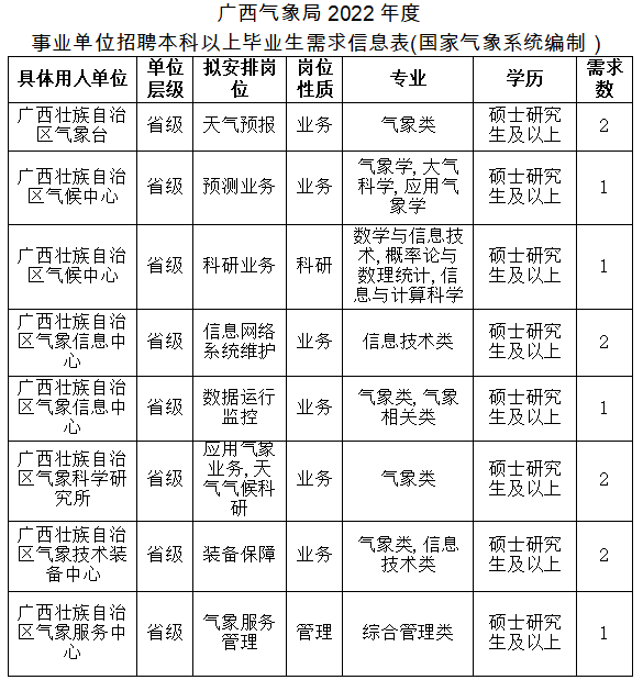 根据《广西气象局2022年度事业单位招聘工作方案》的规定,广西气象部门面向各大院校招聘本科以上应届高校毕业生。现将有关事项公告如下:
