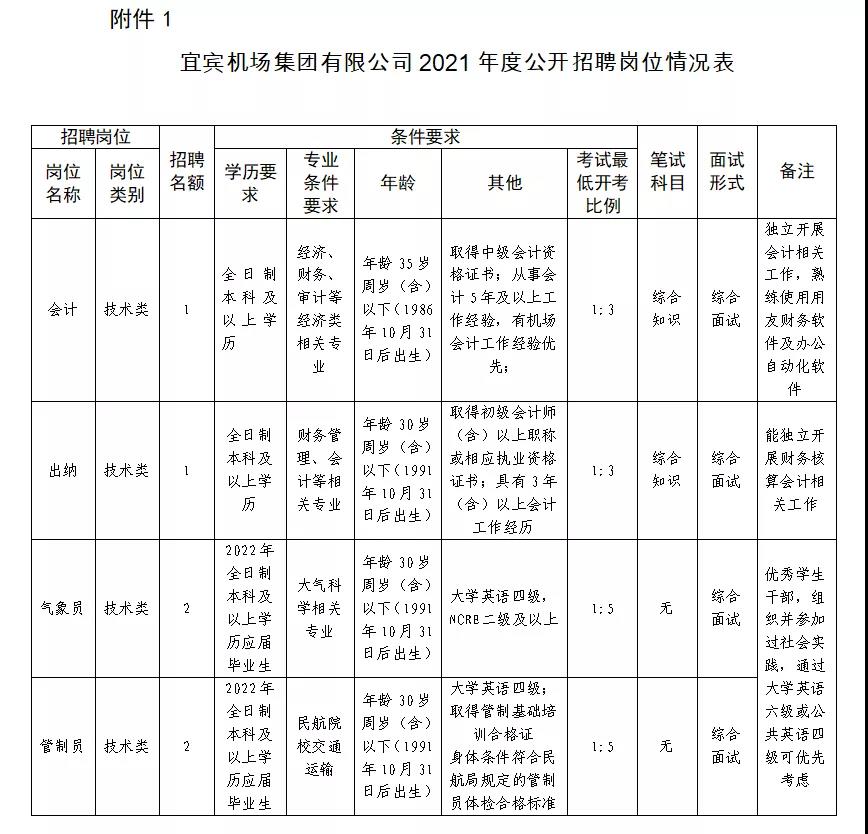 为满足宜宾五粮液机场运营及业务发展需要,加快人才队伍建设,经宜宾机场集团有限公司研究,现面向社会公开招聘会计员、出纳员,面向2022届应届毕业生招聘管制员和气象员,现将有关事项公告如下: