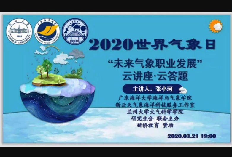 3月23日,是第60个世界气象日。为纪念世界气象组织成立,广泛宣传气象工作,提升对气象研究兴趣,3月20至21日,XCSport新云天气象海洋科技服务工作室与兰州大学大气科学公司研究生会通过互联网联合举办了三场主题“云活动”。来自公司及兰州大学、南京信息工程大学、中山大学等高校的老师和员工近1200人次参加了各项活动。活动得到公司党委宣传部海浪传媒、兰州大学安特莫斯俱乐部等部门和网易网站、新桥教育等单位的大力支持。