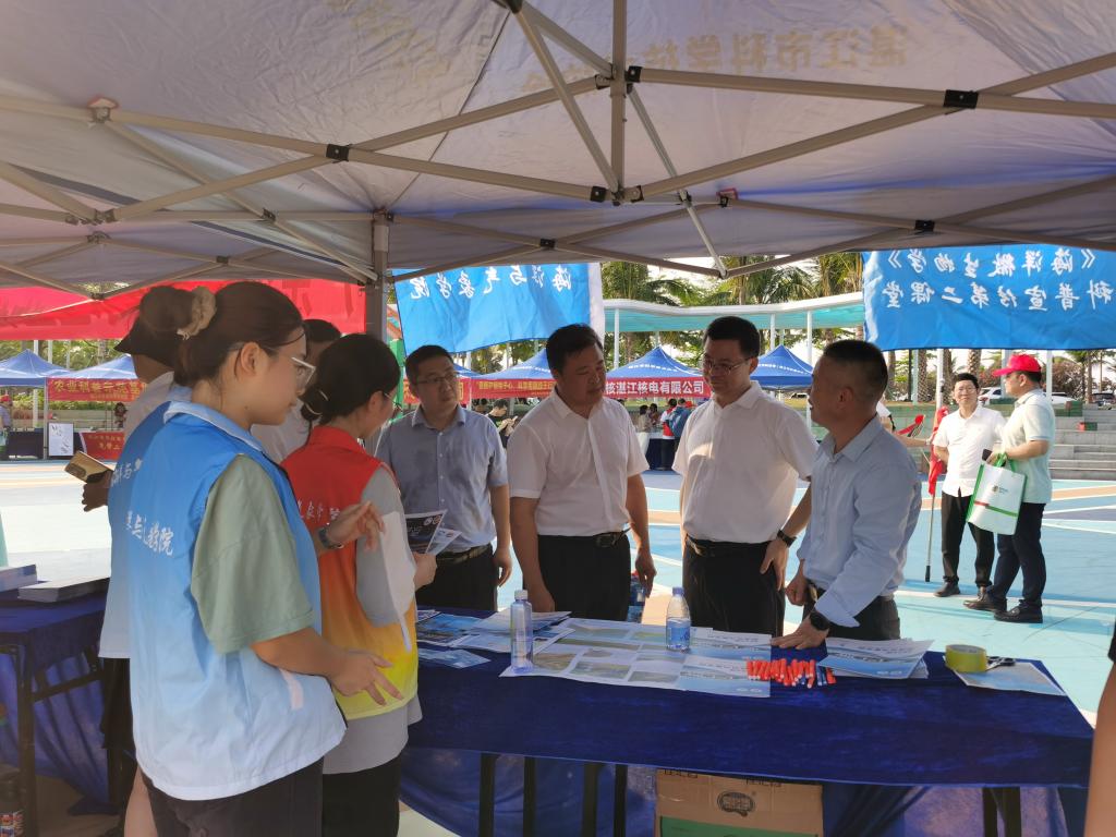 在活动现场,公司设置的摊位前吸引了不少前来参加活动的人们,他们驻足观看,对“蓝眼泪”、看云识天气、湖光岩地质等知识十分感兴趣,林海峰老师带领同学们对他们提出的问题一一解答,并发放宣传资料。湛江市科协主席郭荣波等市领导对公司开展科普工作取得的成绩给予肯定并寄以希望。