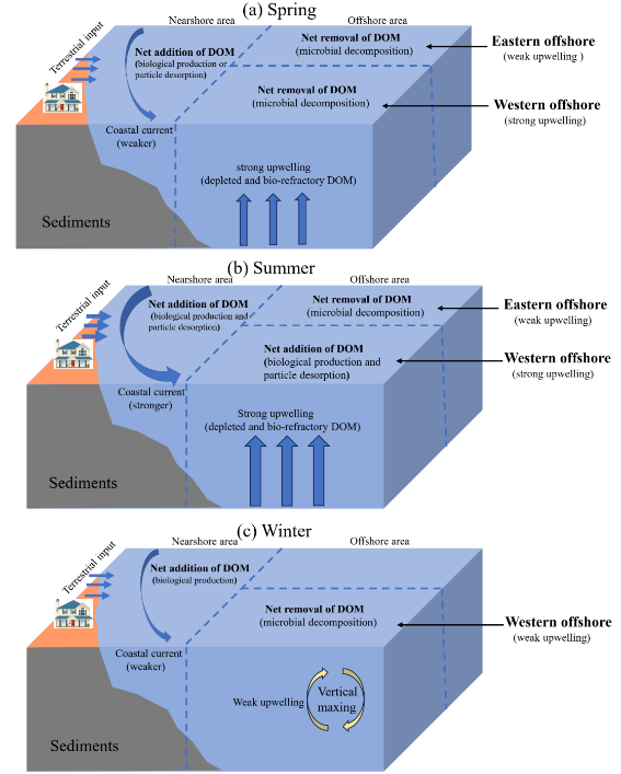 图1 粤西海域不同季节DOM动力学过程示意图