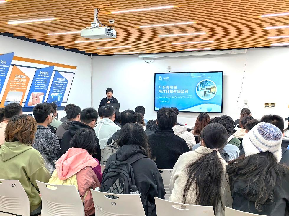 同学们接下来参观了广州至远海洋科技有限公司。首先,工程师带领大家参观了研发部门,这里主要负责开发和改进用于海洋探测与监测的各种设备,包括6000米深水摄像头、微光摄像头,中小型水下机器人,无人船、单波束测深仪、CTD等产品,针对机器人的工作原理和数据采集方式及无人船内部结构与搭载设备工程师进行了详细介绍。随后,工程师介绍了公司的主要业务方向,包括深入追踪海洋行业客户的实际应用需求,从事海洋仪器设备的自主研发和集成应用,助力海洋仪器设备的国产化推广与应用等,工程师还分享了一些公司在技术创新和服务客户方面取得的成绩和面临的挑战。此次参观使同学们获得了宝贵的第一手经验,加深了他们对海洋科技行业的理解,同时也激发了对未来职业发展的兴趣。
