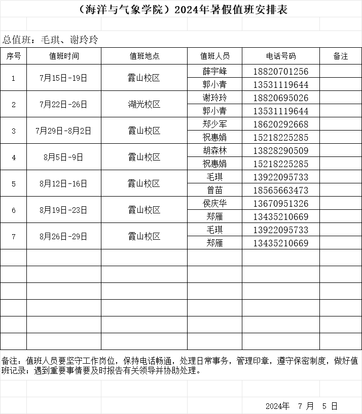 2024年暑假值班表