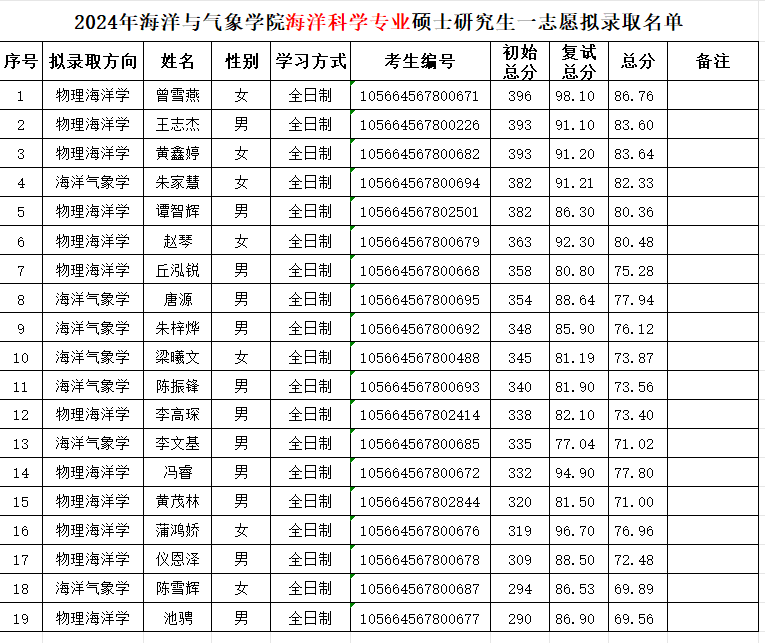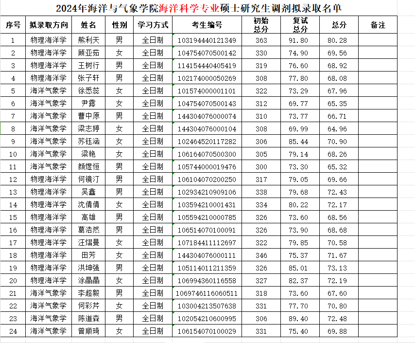现将XCSport海洋科学专业2024年硕士研究生一志愿及调剂拟录取员工名单予以公示,公示期为3个工作日,即4月26日-4月28日。公示期内如对结果有异议,可以书面形式向公司予以提出。