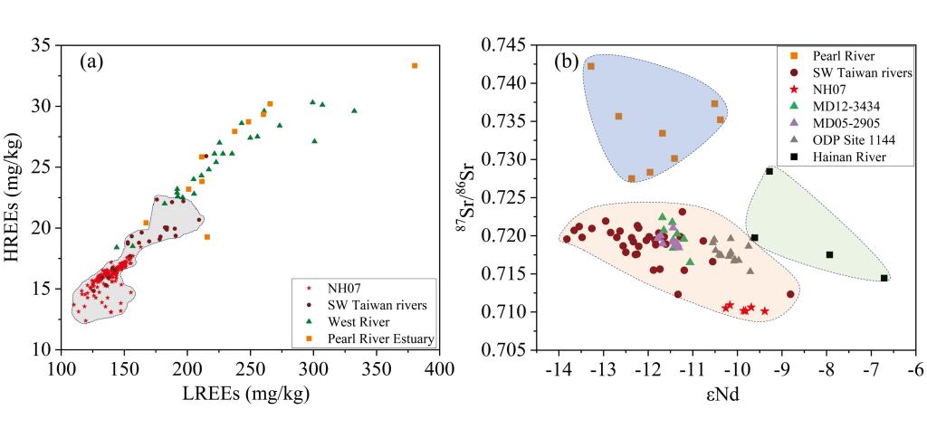 公司海洋地质团队成员黄超副教授以南海北部陆坡的NH07岩心为研究对象(图1),通过高分辨率的地球化学和粒度分析,重建末次冰消期以来南海北部陆坡沉积物的源–汇过程,并探讨其对气候变化和黑潮入侵南海的响应机制。稀土元素和Sr–Nd同位素分析表明,台湾西南部河流是NH07岩心沉积物的主要来源(图2)。粒度敏感组分分析发现,敏感粒度组分2(24.7–27.9 μm)可以用于示踪黑潮入侵南海的可靠指标,从而重建了末次冰消期以来黑潮入侵南海的演化历史。研究结果表明,黑潮入侵南海北部的强度与开放太平洋黑潮主轴的强度呈现反相关关系,主要受东亚季风和ENSO活动的调控(图3)。在末次冰消期(16, 000–11, 700 cal yr BP),黑潮入侵南海北部的强度较大,沉积物来源和输运主要受海平面变化与黑潮入侵强度的共同驱动,而化学风化强度主要受控于低海平面暴露的陆架物质再风化作用影响;全新世时期(11, 700 cal yr BP–至今),黑潮入侵南海北部的强度整体较弱,东亚夏季风成为控制陆源物质输运和化学风化强度的主要因素。该研究深化了对边缘海沉积系统响应季风气候演变、海平面变化和海洋环流格局的理解。