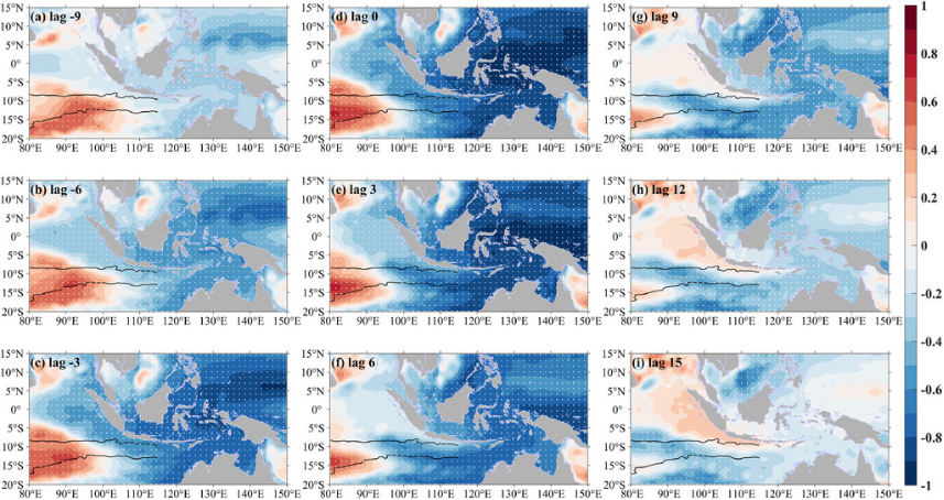 图1.东南印度洋-西太平洋区域海表面高度异常(SLA)与Niño-3.4指数在ENSO峰值[Dec(0)]前9个月[Mar(0)]至后15个月[Mar(2)]期间的相关系数。白点表示通过95%蒙特卡洛置信度检验的值。
